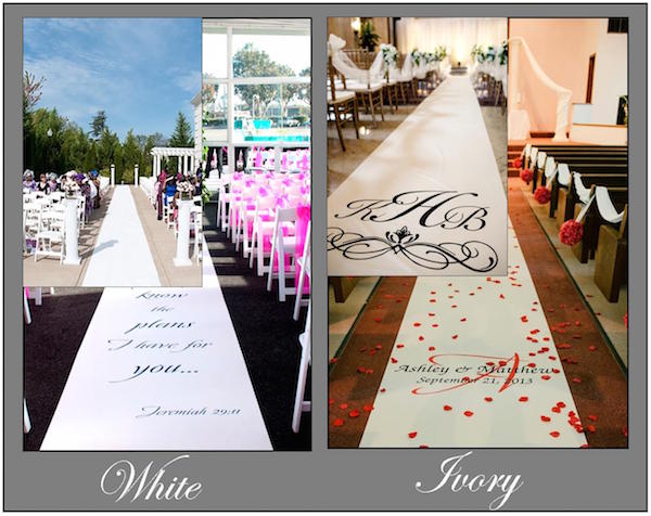 We sell both plain and personalized wedding aisle runners in different fabric weights and in shades of White and Ivory. The lightweight fabric (in the pricing chart) works great on both indoor and solid outdoor surfaces, such as carpet, tile, concrete, bricks, and asphalt, etc. Our heavy weight fabric is more than twice as thick as the lightweight fabric and works great on all surfaces, including uneven outdoor surfaces such as gravel, sand, dirt and grass. Standard width is 45 inches, but 36"-45" widths are available. Email us for free samples.